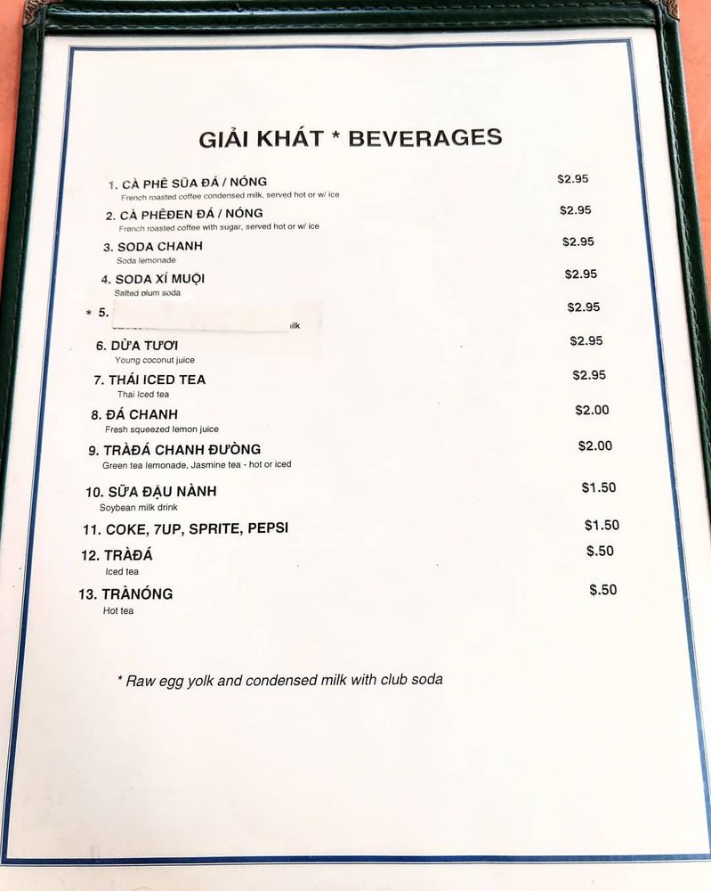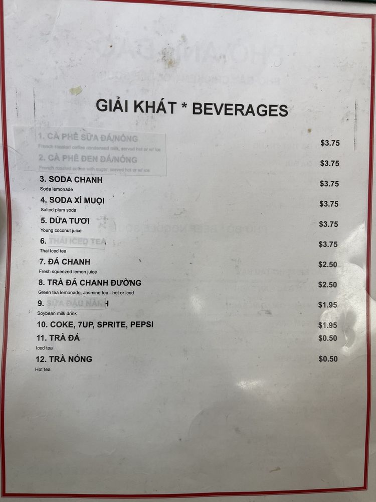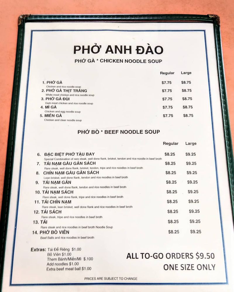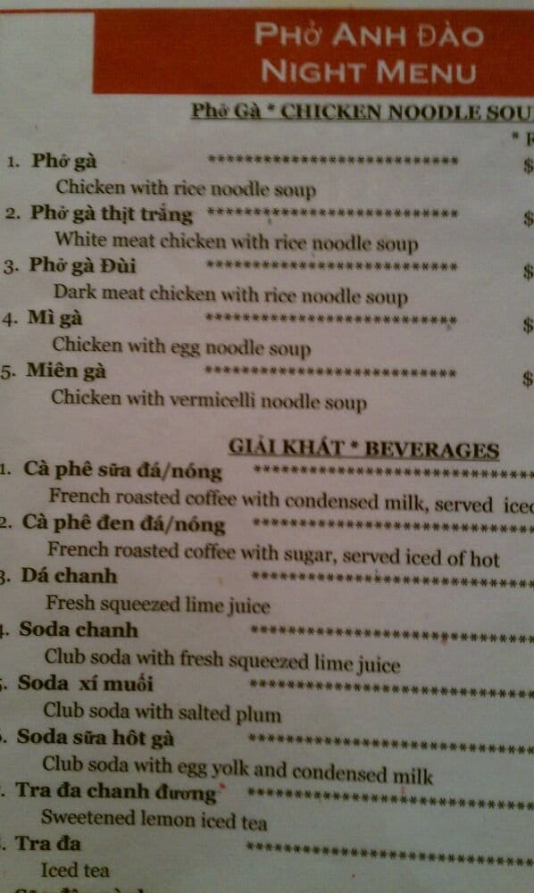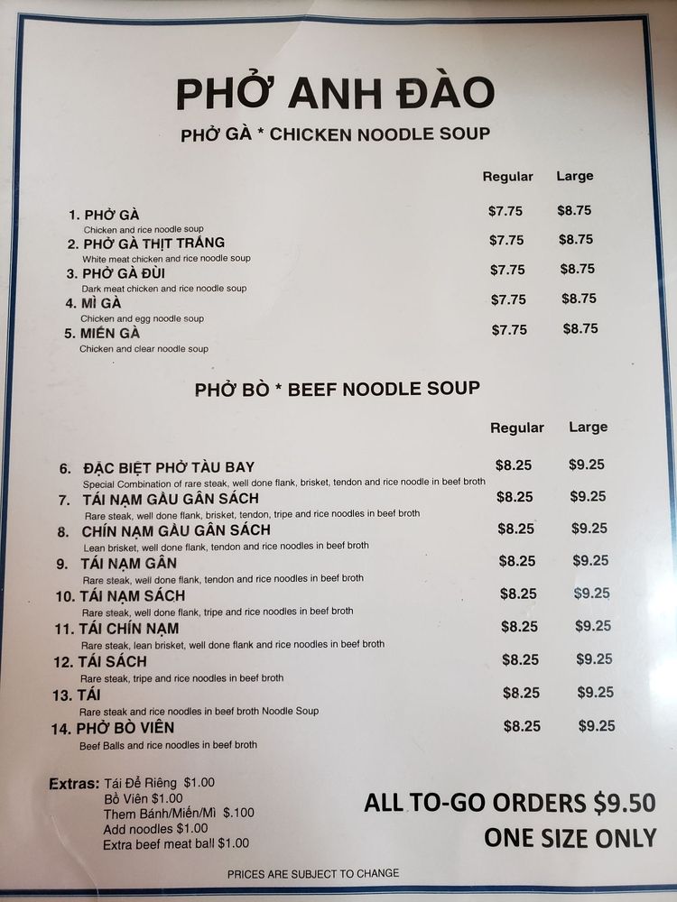 Pho Anh Dao Menu